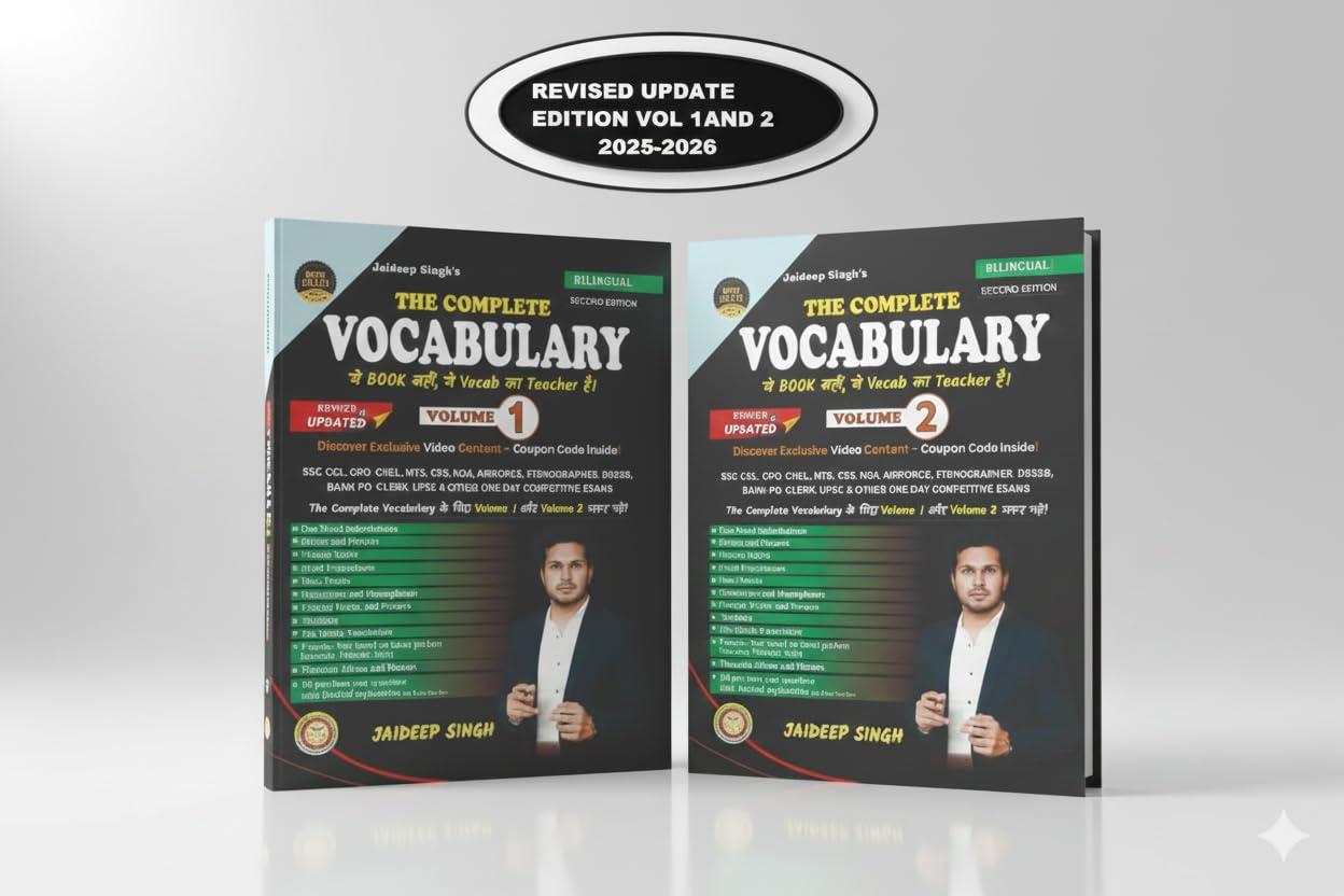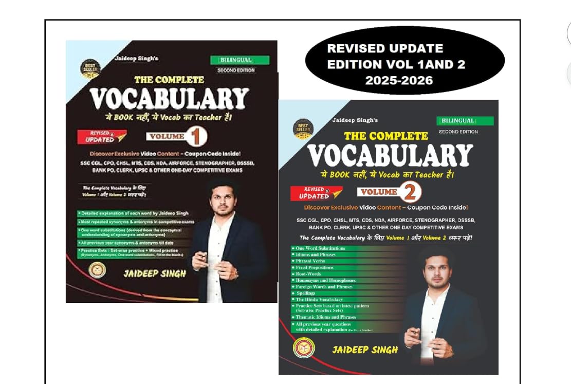 Master your vocabulary preparation with this comprehensive bilingual book set designed for competitive exam aspirants. The Complete Vocabulary set includes two meticulously crafted volumes updated for 2025-2026, covering extensive content for SSC CGL, CPO, CHSL, MTS, CDS, NDA, Bank PO, UPSC and other prestigious examinations. Volume 1 features detailed word explanations, synonyms, antonyms, and practice sets, while Volume 2 delves into one-word substitutions, idioms, phrasal verbs, root-words, homophones, and specialised Hindu vocabulary. The bilingual format makes learning accessible, with both English and Hindi explanations. Each concept comes with extensive practice materials including set-wise practice, mixed practice, and previous years’ questions with detailed solutions. The books include exclusive video content access through an included coupon code, enhancing the learning experience. Perfect for serious aspirants aiming to build a strong vocabulary foundation for competitive success.